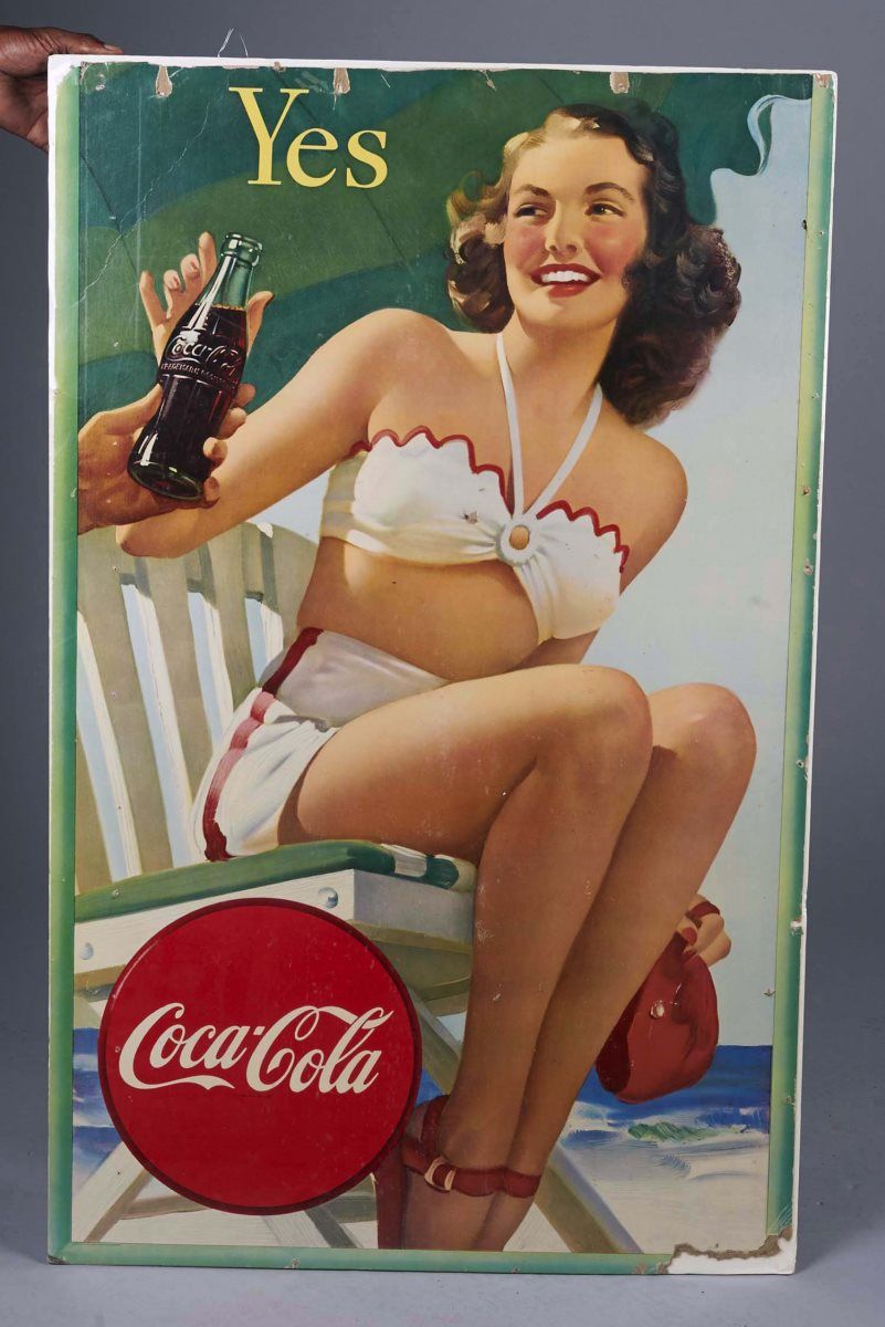 Large ad sign of a brunette at the beach with the slogan "Yes", circa 1947. Displays well with some edge paper loss. Top is trimmed. Condition (Fair). Size 29" x 47"