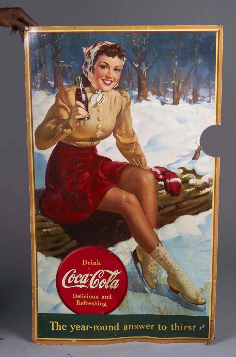 Has "The Year Round Answer to Thirst" slogan, printed by Snyder & Black of New York. Image shows an Auburn haired beauty on ice skates, circa 1940. Water damage on lower edge, half-moon circle missing on middle right edge. Condition (Fair). Size 30" x 50"