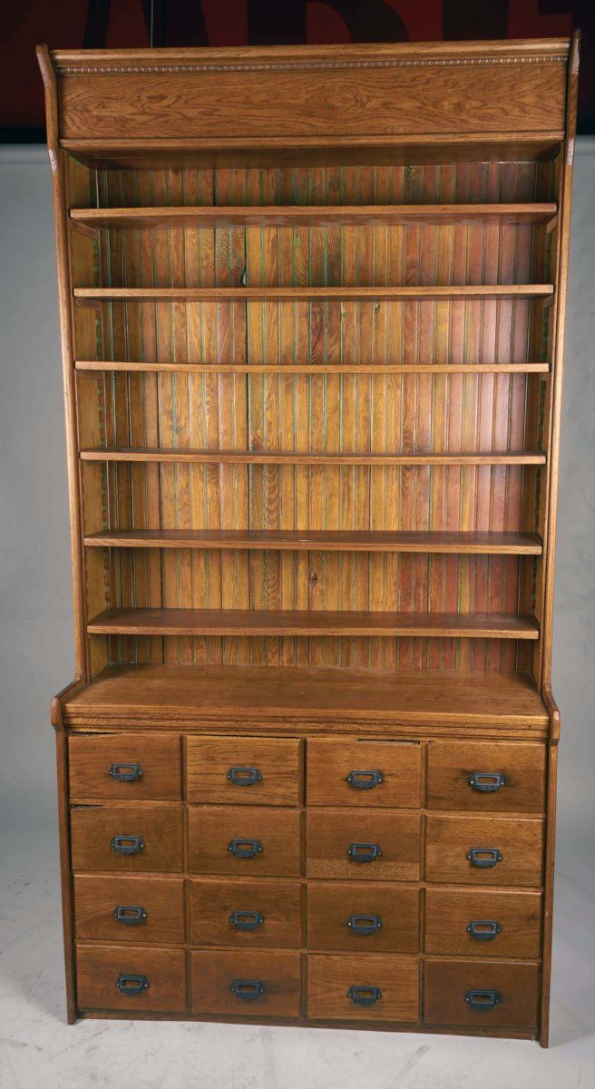 Large country store mercantile shelf and drawer storage unit with three shelves and sixteen drawers. Drawer handles are ornate and include a space to insert a paper label to mark what is each drawer. Note-picture incorrectly shows no shelves Condition (Ve