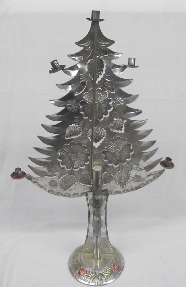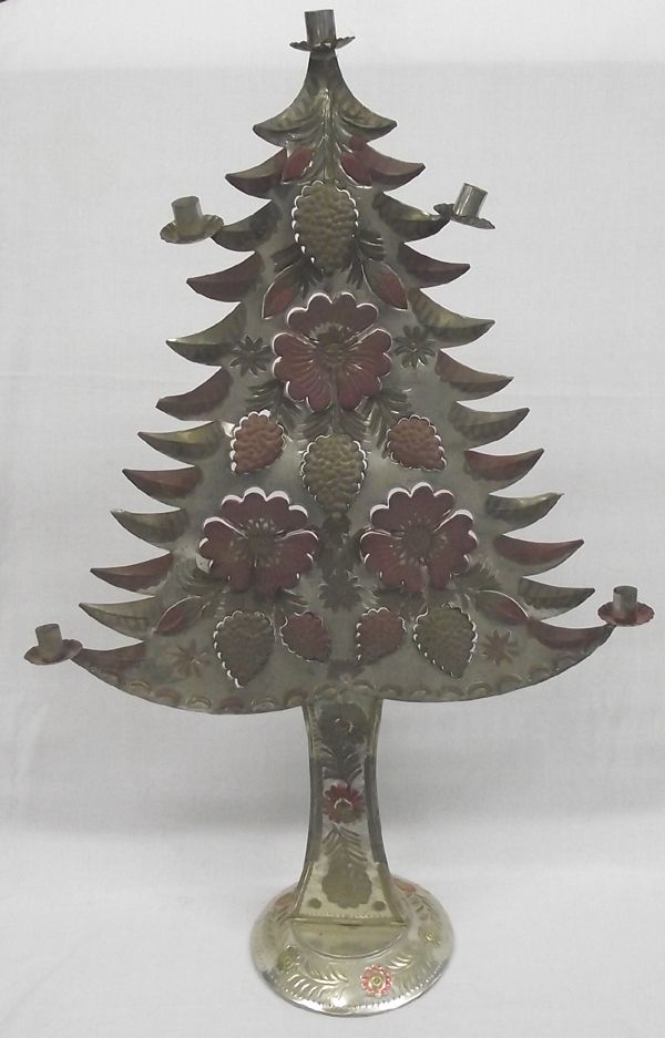 Tall Mexican Folk Art Tin Candlestick Holder. Measures 32''H x 20''W. Four candle holders. Painted with pinks, purple and some green on flowers, leaves and fruits. Has age. From Proctor Collection, Silver City, New Mexico.