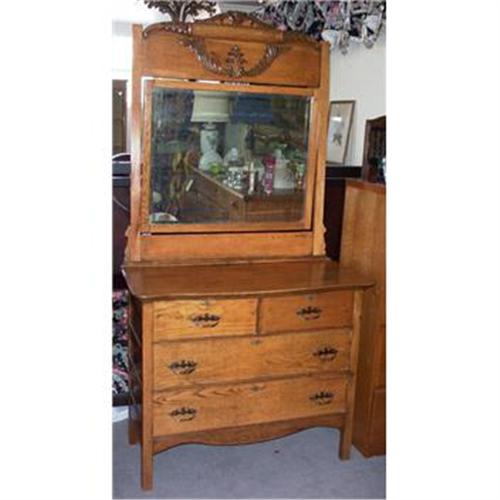 <table width="100%" border="0" cellspacing="0" cellpadding="4"><tr><td><em> </em></td></tr><tr> <td width="100%"> This beautiful oak dresser, which may date to the latter half of the 20th Century, features a large rectangular beveled mirror at its top, and a base with four drawers (two small drawers on top, two large drawers underneath) with intricately detailed hardware. This solidly crafted piece also has a finely detailed carved design affixed to the top of the mirror's frame, which adds to its beauty. This piece does have a small split in the wood on its dresser top, but is overall in very good condition, and would make a perfect addition to any bedroom. Shipping costs will be calculated at the time of purchase (as costs will vary depending on the location of the buyer) at the best possible rate. </td></tr><tr> <td> </td></tr><tr> <td>Reference #: RAF3604</td></tr><tr><td>Condition:very good</td></tr><tr><td>Year:latter half of 20th Cent.</td></tr><tr><td>Height:78</td></tr><tr><td>Depth:19</td></tr><tr><td>Width:40</td></tr><tr><td>Title:Tall Oak Dresser with Mirror</td></tr><tr><td>Materials:oak, mirror</td></tr><tr><td>Location:Marion, SC</td></tr></table>