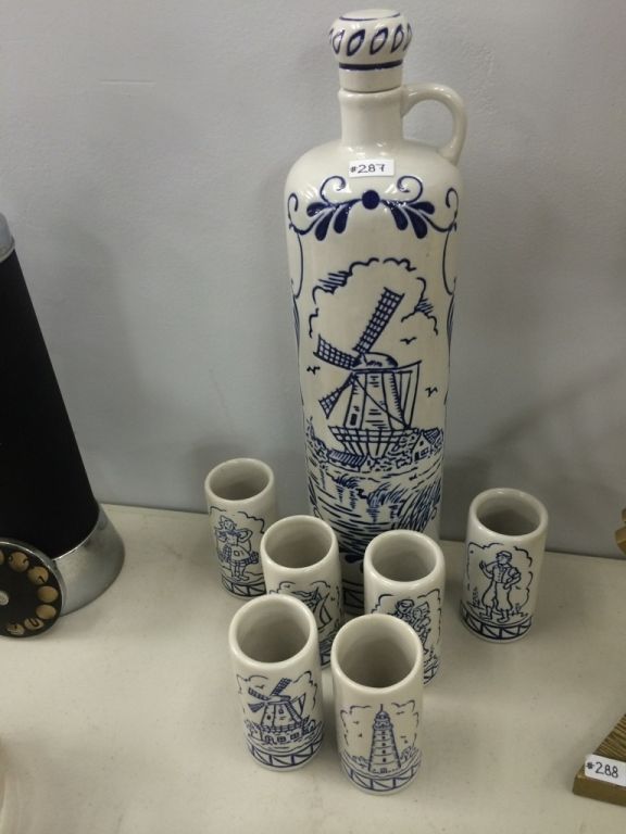 Tall Pottery Decanter With 6 Glasses