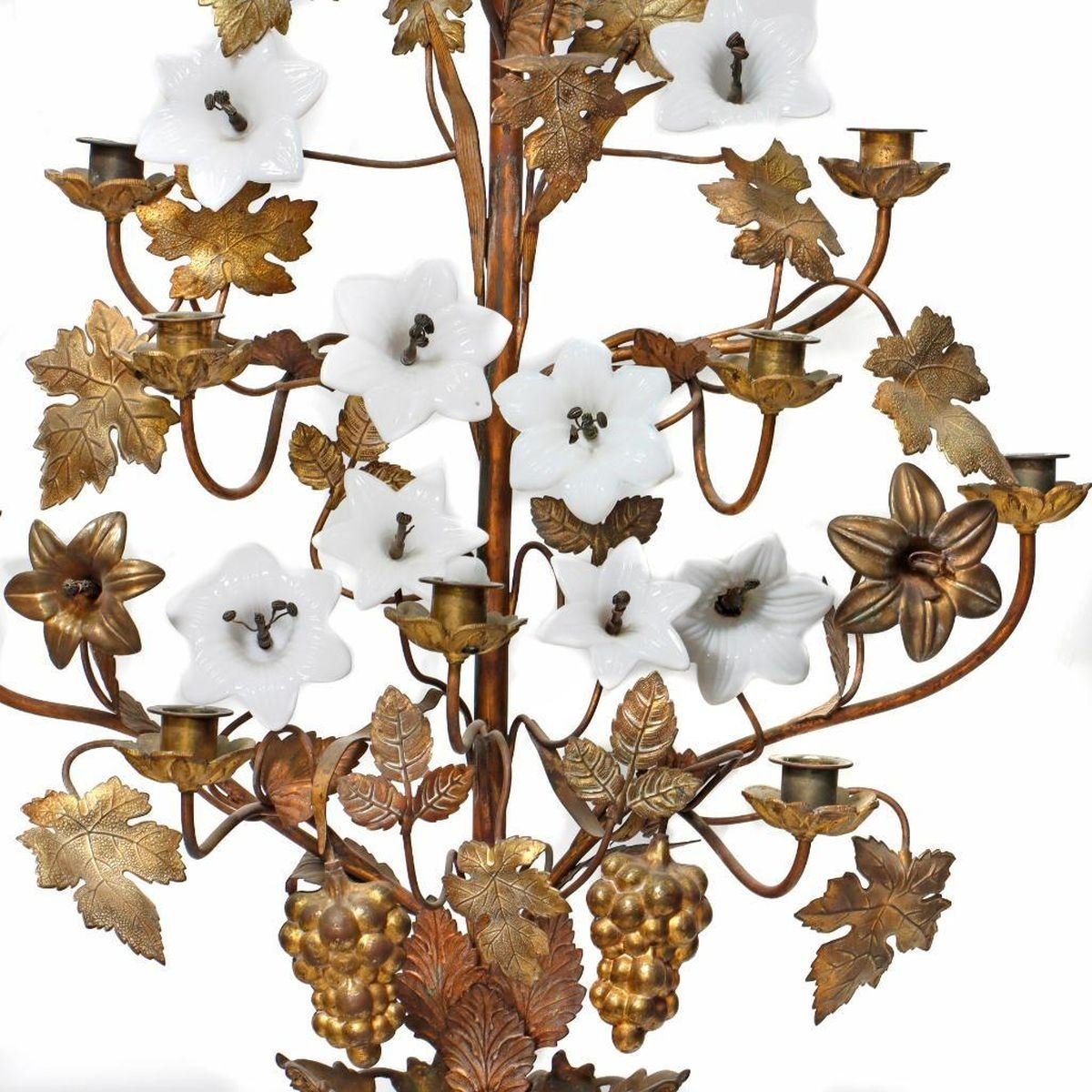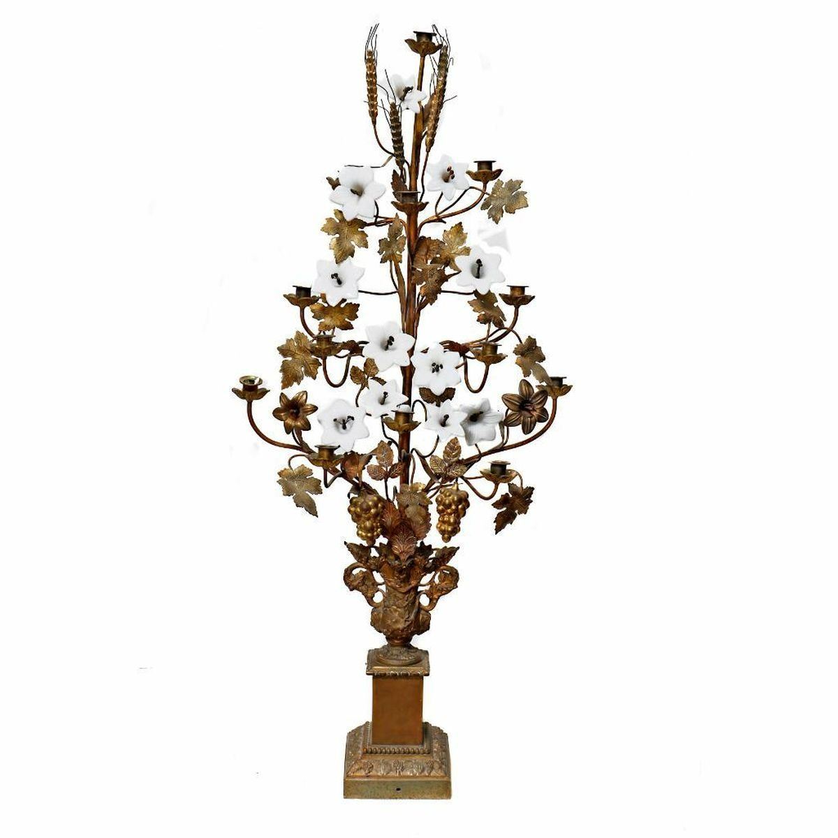 With grapevine and wheat motif, and gilt and milk glass flowers. The base is a leaf-molded vase form on a square pedestal. 46 1/2in. h. x 21in. w. Condition: Good; some wear to gilt. Note: Large for shipping.