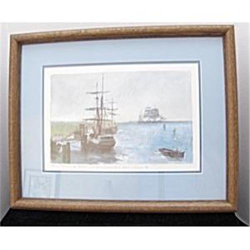 This has been looked at and admired by all manner of experts. It has been deemed the work of a regional artist, probably East coast (tall ships), expertly done with archival frame, mat, papers etc. No one could seem to decipher the writing at the bottom of the painting. but one brave soul ventured a guess of Karl Lawson or Larson (last two words). We wish we could be sure.