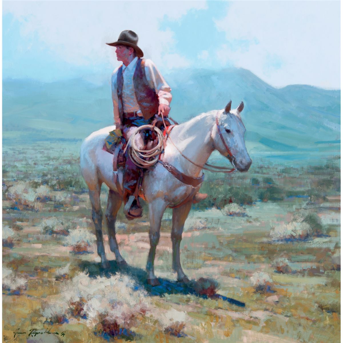 Growing up in California near the Donner Pass, a place that gave rise to many a tale, Jim Reynolds was steeped in the lore of the Old West. At 13, Reynolds received a calendar with a reproduction of a Frank Tenney Johnson and he began to wonder what it would take to be able to paint like that. After a stint in the Navy in World War II, Reynolds studied art, became a commercial illustrator, and enjoyed great success as a storyboard and set artist in Hollywood. In 1967, Reynolds heeded an inner call and moved to Arizona, where he became an instant celebrity among Western painters, praised for his vibrant palette, impressionistic brushwork and lively animals and figures. Tall in the Saddle is classic Reynolds from hat to sagebrush. But what is the cowboy stretching himself to peer at? He doesn’t look worried...yet. But what’s out there in the haze and dust? A mirage? Or something else?