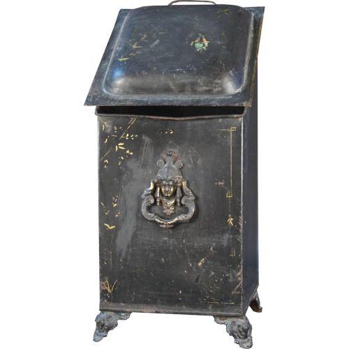 Tall & ornate tin coal bin with actress face on front 9" x 10" x 24" tall