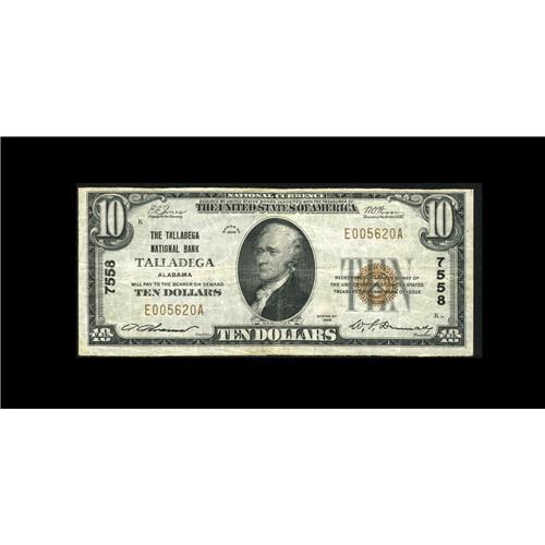 <B>Talladega, AL</B></I> - $10 1929 Ty. 1 <B>The Talladega NB</B></I> Ch. # 7558<BR>A nice grade small example. <B>Fine-Very Fine.</B></I>