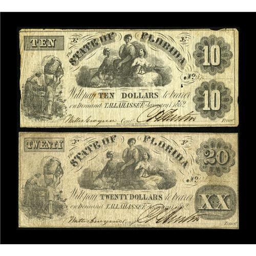 <B>Tallahasse, FL- State of Florida</B></I> $20; $10 Jan. 1, 1862 Cr. 12A; 13A<BR>The notes grade <B>Fine</B></I> with the $10 being brighter and possesing a few tiny holes.<BR><I>From The William A. "Bill" Bond Collection</B></I><BR><BR><b>Shipping:</b> Coin/Currency (<a target="_blank" href="http://www.heritageauctions.com/common/shipping.php">view shipping information</a>)