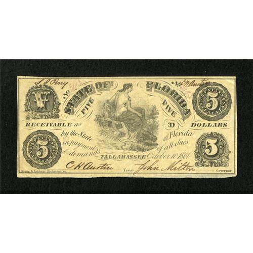 <B>Tallahasse, FL- State of Florida</B></I> $5 Oct. 10, 1861 Cr. 6 <BR> The whole 1861 Florida issue is elusive with this being just the second $5 that we have been able to offer. <B>Very Fine-Extremely Fine.</B></I><BR><BR><b>Shipping:</b> Coins & Currency (<a target="_blank" href="http://www.heritageauctions.com/common/shipping.php">view shipping information</a>)