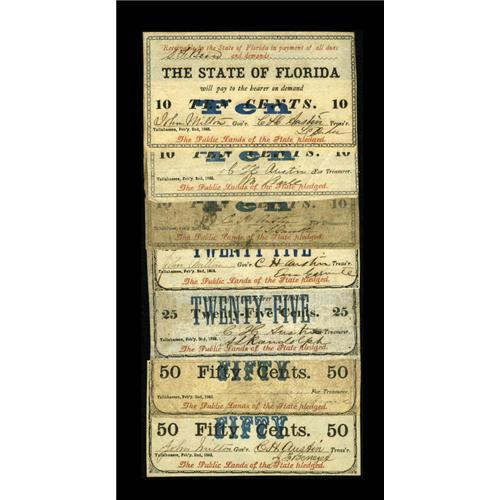 <B>Tallahasse, FL- State of Florida</B></I> 50¢ (2); 25¢ (2); 10¢ (3) Feb. 2, 1863 Cr. 20; 22; 24; 26B; 28; 30; 30B<BR>The notes in this grouping range in grade from <B>VG to CU.</B></I><BR><I>From The William A. "Bill" Bond Collection</B></I><BR><BR><b>Shipping:</b> Coin/Currency (<a target="_blank" href="http://www.heritageauctions.com/common/shipping.php">view shipping information</a>)