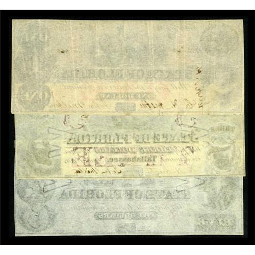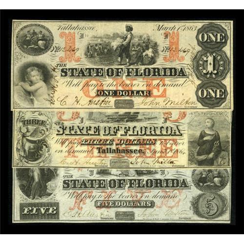<B>Tallahassee, FL- A Trio of State Issues</B></I><BR> $1 Mar. 1, 1863 Cr. 19 <B>Very Fine,</B></I><BR>$3 Jan. 1, 1864 Cr. 37 <B>Extremely Fine-About Uncirculated, </B></I>Watermarked,<BR>and a $5 Mar. 1, 1864 Cr. 35 <B>Very Fine, </B></I>Watermarked.<BR>Each piece is original and attractive with solid red overprints. <BR><BR><b>Shipping:</b> Coins & Currency (<a target="_blank" href="http://www.heritageauctions.com/common/shipping.php">view shipping information</a>)