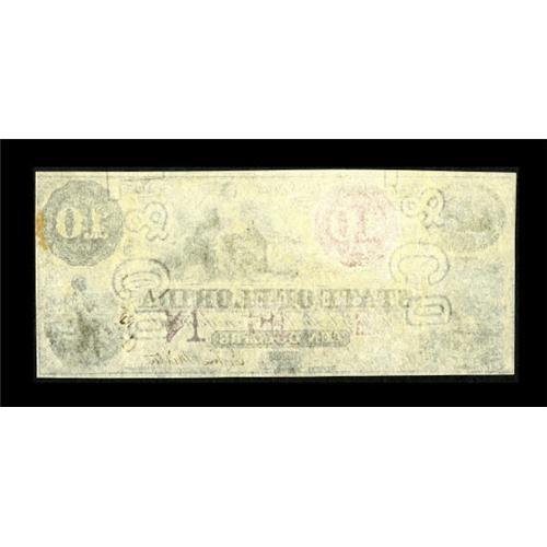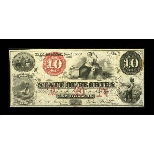 <B>Tallahassee, FL- State of Florida</B></I> $10 Mar. 1, 1864 Cr. 33<BR> Nicely centered <B>Uncirculated, </B></I>although there is an age spot at the upper right border. <BR><I>From The Collection of a Louisiana Gentleman.</B></I><BR><BR><b>Shipping:</b> Coins & Currency (<a target="_blank" href="http://www.heritageauctions.com/common/shipping.php">view shipping information</a>)