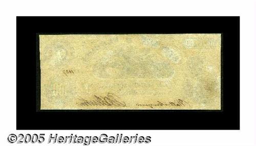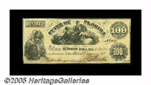 <B>Tallahassee, FL - State of Florida</B></I> $100 Jan. 1, 1862 Criswell 10<BR>This is a handsome $100 that was printed by Hoyer & Ludwig. The central vignette is the same one used when Hoyer & Ludwig printed the Confederate T-17 type in 1861. <B>Choice Crisp Uncirculated.</B></I>