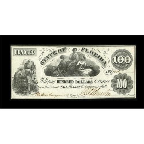 <B>Tallahassee, FL- State of Florida</B></I> $100 Jan. 1, 1862 Cr. 10A<BR> A lovely example which is one tiny corner fold from Choice New. <B>Choice About Uncirculated.</B></I><BR><I>From The Collection of a Louisiana Gentleman.</B></I><BR><BR><b>Shipping:</b> Coins & Currency (<a target="_blank" href="http://www.heritageauctions.com/common/shipping.php">view shipping information</a>)