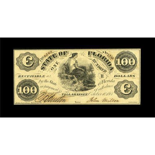 <B>Tallahassee, FL- State of Florida</B></I> $100 Oct. 10, 1861 Cr. 2<BR> <B>Crisp Uncirculated,</B></I> the paper a bit toned .<BR><BR><b>Shipping:</b> Coins & Currency (<a target="_blank" href="http://www.heritageauctions.com/common/shipping.php">view shipping information</a>)