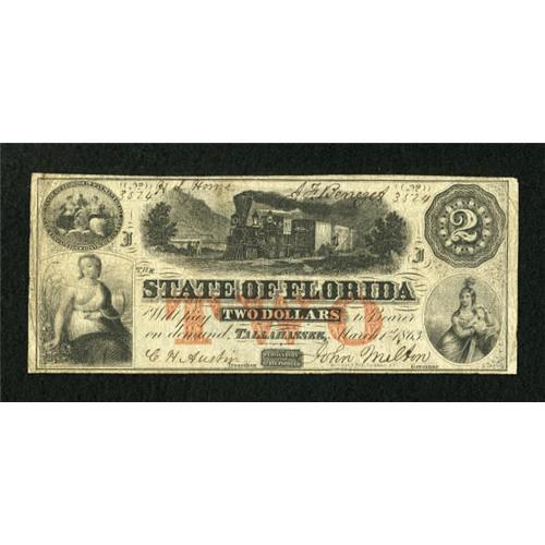 <B>Tallahassee, FL- State of Florida </B></I>$2 March 1, 1863 Cr. 18<BR> This is a problem-free circulated example with a popular train vignette. <B>Fine-Very Fine</B></I>.<BR><I>From The Amelia Island Collection.</B></I><BR><BR><b>Shipping:</b> Coins & Currency (<a target="_blank" href="http://www.heritageauctions.com/common/shipping.php">view shipping information</a>)