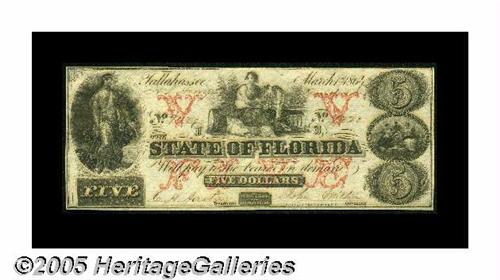 <B>Tallahassee, FL - State of Florida</B></I> $5 Mar. 1, 1864 Criswell 34<BR>This stunning $5 reveals an edge nick and a corner bend after close observation. <B>Crisp Uncirculated.</B></I>