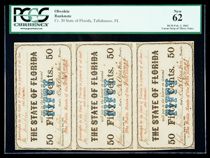 Tallahassee, FL - State of Florida Uncut Strip of Three 50¢ Feb. 2, 1863. PCGS New 62. A nicely preserved vertical strip of three, dislaying good color and dark signatures.