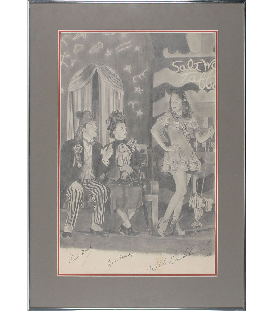 Original vintage signed pencil sketch of a scene from the Thornton Wilder play ‘The Skin of Our Teeth’ on an off-white 13.5 x 21 sheet, done by D. A. Andrews in 1943, signed in the lower border in fountain pen by Tallulah Bankhead, Fredric March, and Florence Eldridge. Double-matted and framed to an overall size of 19.25 x 27. In fine condition. Oversized.