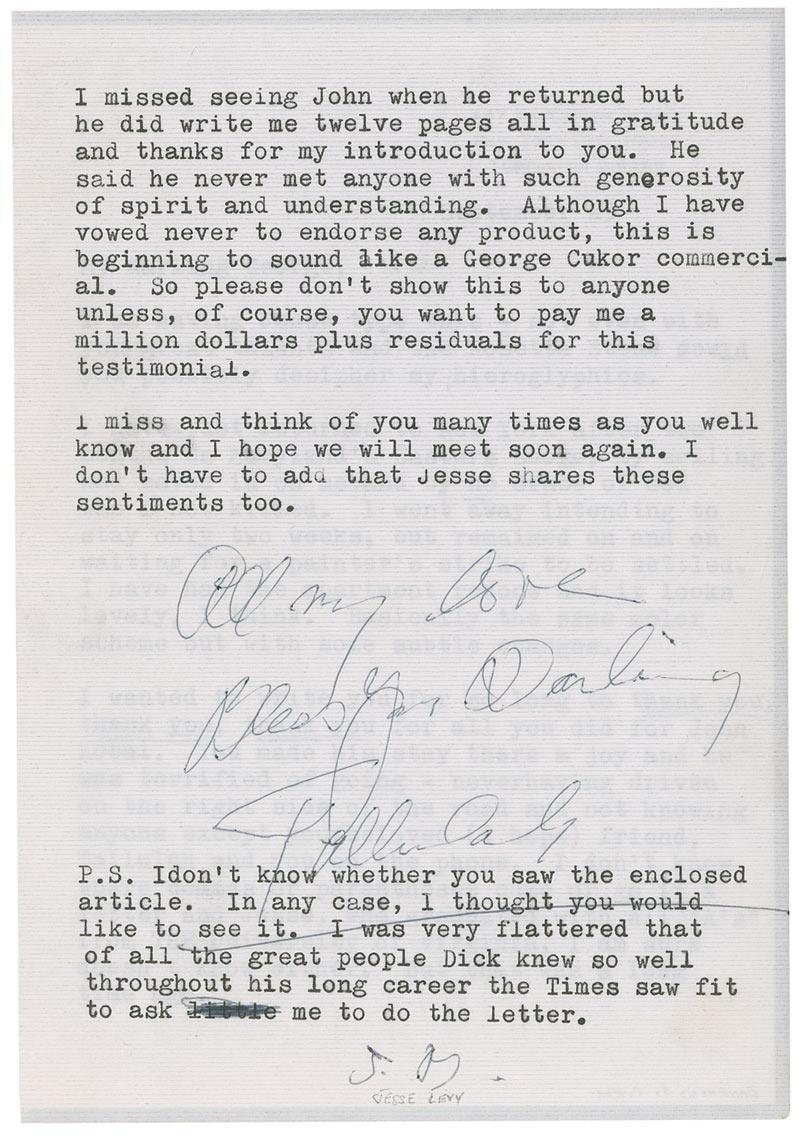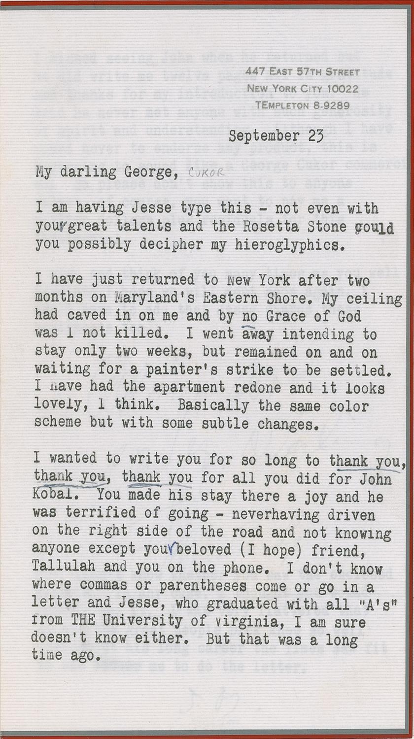 TLS signed “Tallulah,” two pages on two adjoining sheets, 5 x 7.25, personal letterhead, September 23. Letter to George Cukor. In part: “I am having Jesse type this–not even with your great talents and the Rosetta Stone could you possibly decipher my hieroglyphics. I have just returned to New York after two months on Maryland’s Eastern Shore. My ceiling had caved in on me and by no Grace of God was I not killed…Although I have vowed never to endorse any product, this is beginning to sound like a George Cukor commercial. So please don’t show this to anyone unless, of course, you want to pay me a million dollars plus residuals for this testimonial.” In fine condition.