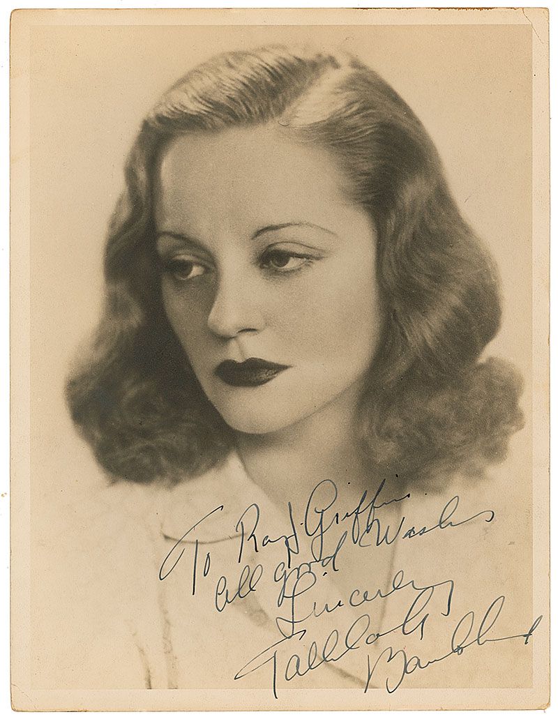 Lovely vintage matte-finish 7.5 x 9.75 portrait of Bankhead, signed and inscribed in fountain pen, “To Ray J. Griffin, all good wishes, Sincerely, Tallulah Bankhead.” In fine condition, with trivial creases to corner tips.