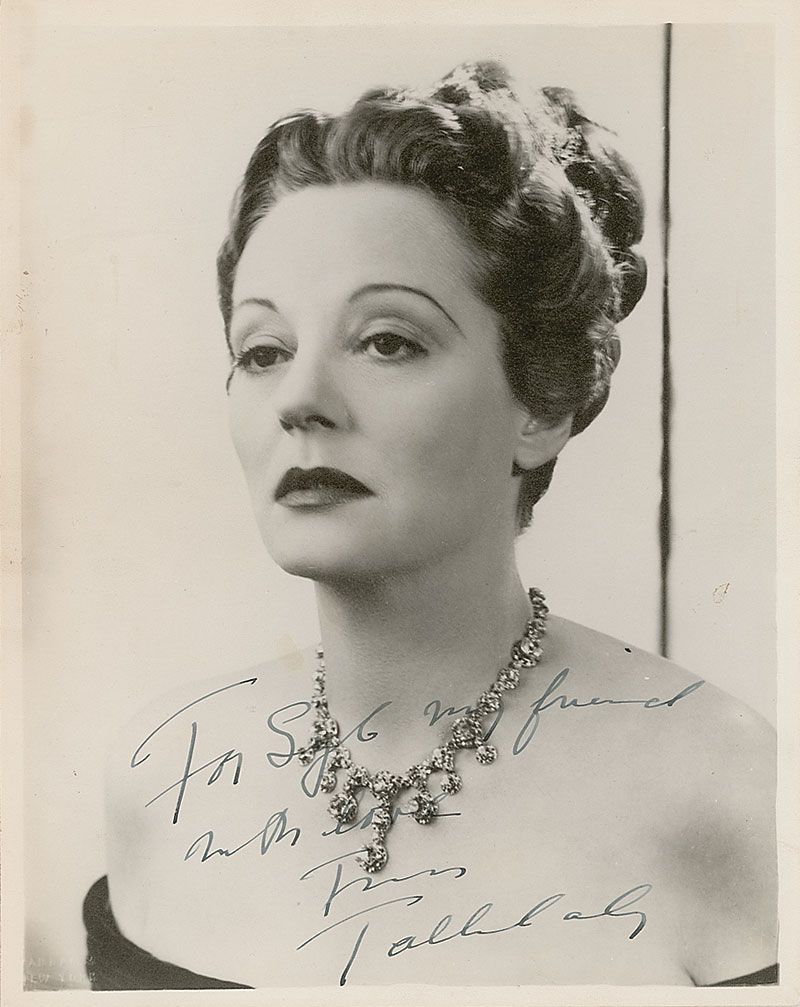 Vintage matte-finish 8 x 10 head-and-shoulders photo of Bankhead in costume for the 1947 Broadway play The Eagle Has Two Heads, signed and inscribed to a friend and colleague, Sybil, in fountain pen, “To Syb, my friend, with love from Tallulah.” Rippling along left edge and mounting remnants to reverse, otherwise fine condition. Interestingly, Bankhead had co-star Marlon Brando fired from the play shown here; luckily for him, he was soon cast in A Streetcar Named Desire, which launched him into stardom.