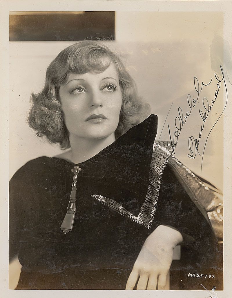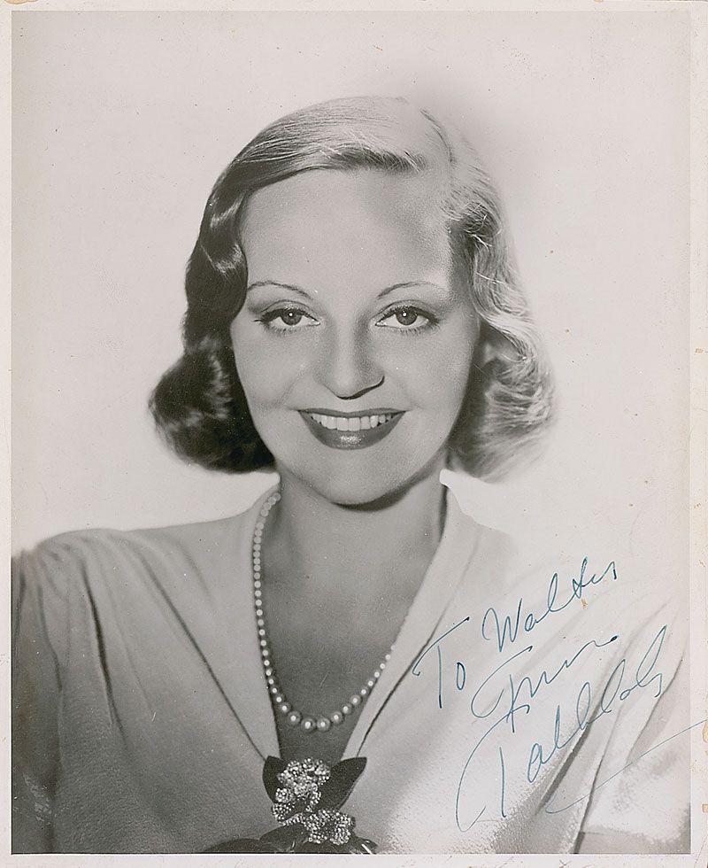 Two vintage glossy 8 x 10 photos of Bankhead from early in her career, including one crystal-clear studio portrait, each signed in fountain pen, with Bankhead adding a brief inscription to one photo. Photos are affixed to identical size sheets or mounts. In very good condition, with scattered creases and surface marks, heavier to studio portrait, along with a tear to bottom edge, and a bit of light discoloration from adhesive on reverse.
