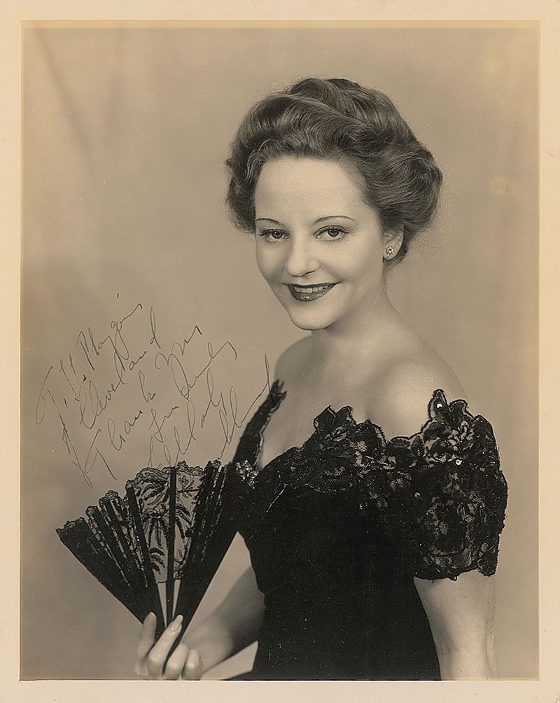 Vintage matte-finish 8 x 10 photo of Bankhead wearing a black lacy bare-shouldered dress, signed and inscribed in fountain pen, “To the Playgoers of Cleveland, Thank you, Sincerely, Tallulah Bankhead.” Reverse bears a Vandamm Studio photographer’s stamp. In fine condition.