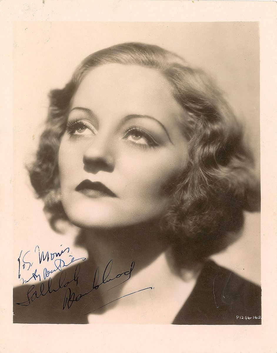 Beautiful glossy 8 x 10 close-up portrait of the acclaimed stage and screen actress, signed and inscribed in fountain pen, “Best wishes, Tallulah Bankhead.” In very good to fine condition, with silvering to darker areas of the image.
