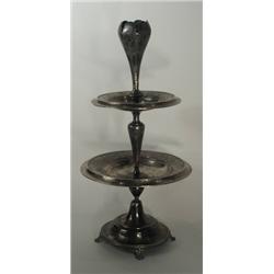 Ezüst, 986 g, 4 plasztikus lábon álló vésett mintázatú kerek talpon, öblösödo henger alakú test két hullámos mintázattal díszített tányérkával, kehely alakú vésett mintázatú díszített véggel. Jelzett: osztrák, XIX sz. vége, VC feloldatlan mesterjellel.