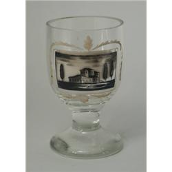 Fúvott színtelen üveg, kerek talpon henger alakú test, felületén kézi festésu tájkép, 1900-as évek eleje, M.: 13 cm