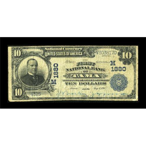 <B>Tama, IA</B></I> - $10 1902 Plain Back Fr. 628 <B>The First NB</B></I> Ch. # 1880<BR> Two blue signatures remain bold on this Tama County issue. Our records indicate only two notes from this bank have been offered at public auction including an Original Ace in Fine that realized more than $25,000. <B>Very Good.</B></I><BR><BR><b>Shipping:</b> Coins & Currency (<a target="_blank" href="http://www.heritageauctions.com/common/shipping.php">view shipping information</a>)