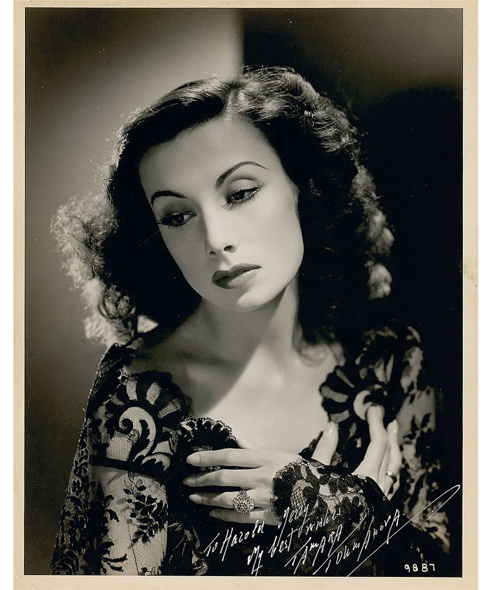 Captivating vintage pearl-finish 10.25 x 13 photo of Toumanova in black lace, signed and inscribed in white ink, “To Harold Merry, My best wishes, Tamara Toumanova.” In fine condition, with some scattered light corner and edge creases, most of which could be matted out.