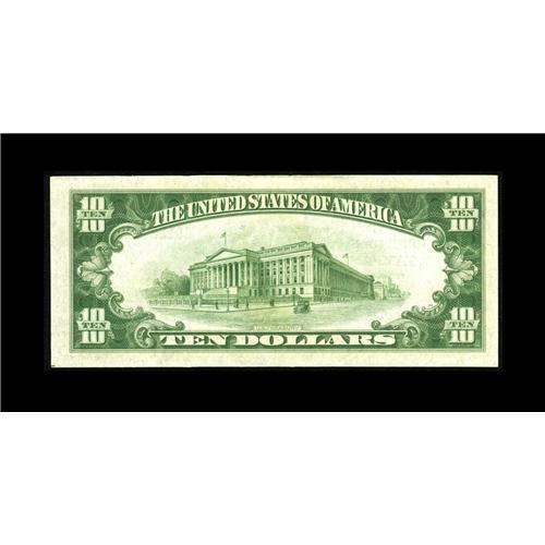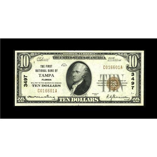 <B>Tampa, FL</B></I> - $10 1929 Ty. 1 <B>The First NB</B></I> Ch. # 3497<BR>This wide margined $10 with natural paper ripple has some of the boldest embossing ever seen on a national by this cataloger. The embossing is fully punched through where appropriate. This $10 joins a small CU run listed in the census. In fact less than a year ago a CU $10 that is three serial numbers away brought nearly $750 at auction. <B>Gem Crisp Uncirculated.</B></I><BR><BR><b>Shipping:</b> Coin/Currency (<a target="_blank" href="http://www.heritageauctions.com/common/shipping.php">view shipping information</a>)