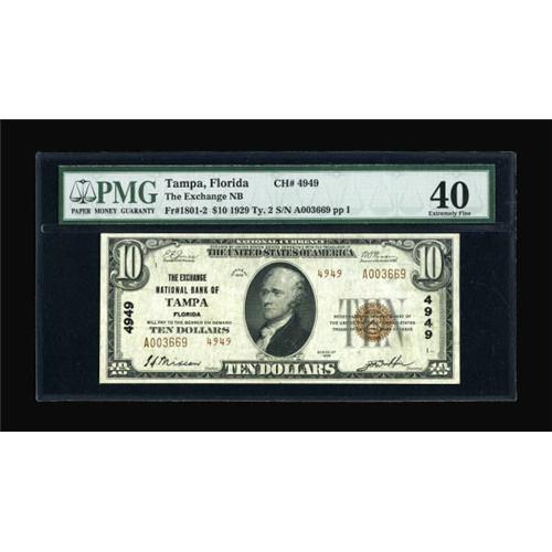 <B>Tampa, FL</B></I> - $10 1929 Ty. 2 <B>The Exchange NB</B></I> Ch. # 4949<BR> Most small examples from this bank are low grade and unattractive, especially the few Type 2 notes recorded in the census. This piece, which is new to that listing, is a happy exception. PMG has graded this note <B>Extremely Fine 40, </B></I>a grade we see little to disagree with. <BR><I>From The Sunshine State Collection.</B></I><BR><BR><b>Shipping:</b> Coins & Currency (<a target="_blank" href="http://www.heritageauctions.com/common/shipping.php">view shipping information</a>)