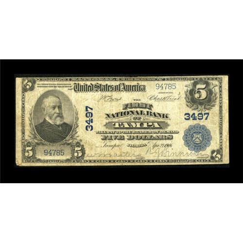 <B>Tampa, FL</B></I> - $5 1902 Plain Back Fr. 599 <B>The First NB</B></I> Ch. # 3497<BR> The First enjoyed being the largest national bank in the city during the tenure of National Bank Notes. Members of the Taliaferro family managed this bank for many years before stepping aside for the tandem of R.W. Masters and B.J. Binnicker. <B>Fine</B></I>.<B></B></I><BR><I>From The Kansas City Collection.</B></I><BR><BR><b>Shipping:</b> Coins & Currency (<a target="_blank" href="http://www.heritageauctions.com/common/shipping.php">view shipping information</a>)
