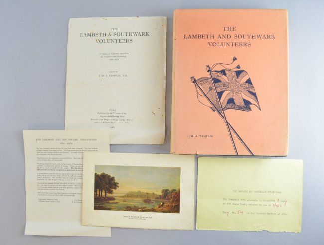 Tamplin, The Lambeth and Southwark Volunteers pub. by The Trustees of the Regimental Historic Fund, 1965, no. 54 of 600 copies, to include a list of the Subscribers, and a brief overview of the book prior to publication together with a Christmas Card and wishes for the coming year, with a view of Windsor from the river, circa 1823, with facsimile signature 'Mary R, 1952 3' Provenance: The book is being sold by the son of a former member of the Lambeth and Southwark Volunteers, a territorial army who were formed on 13th March 1860, and were originally part of the 19th Corps, Surrey Rifle Volunteers but were re-titled many times during their history. The book is a commemoration of their one year existence, 1860 - 1960. The Christmas Card from Mary R, believed to be Princess Mary (1897 - 1965) who may have been a patron of the volunteers.