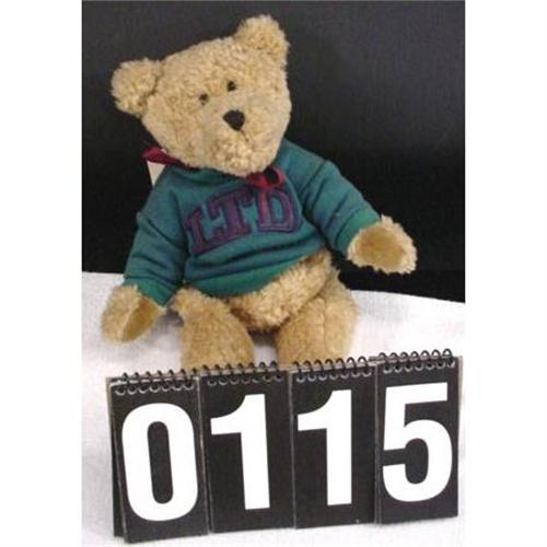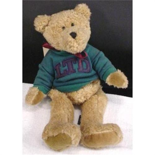 A light tan bean-filled Teddy Bear made by The Boyd Collection Ltd between 1985 and 1994. Bear has green sweater and violet bow and is a J.B. Bean and Associates Investment Collectible. Bear is in good condition and measures 14" x 6" x 4" and weighs 1 pound 3 ounces. [84]
