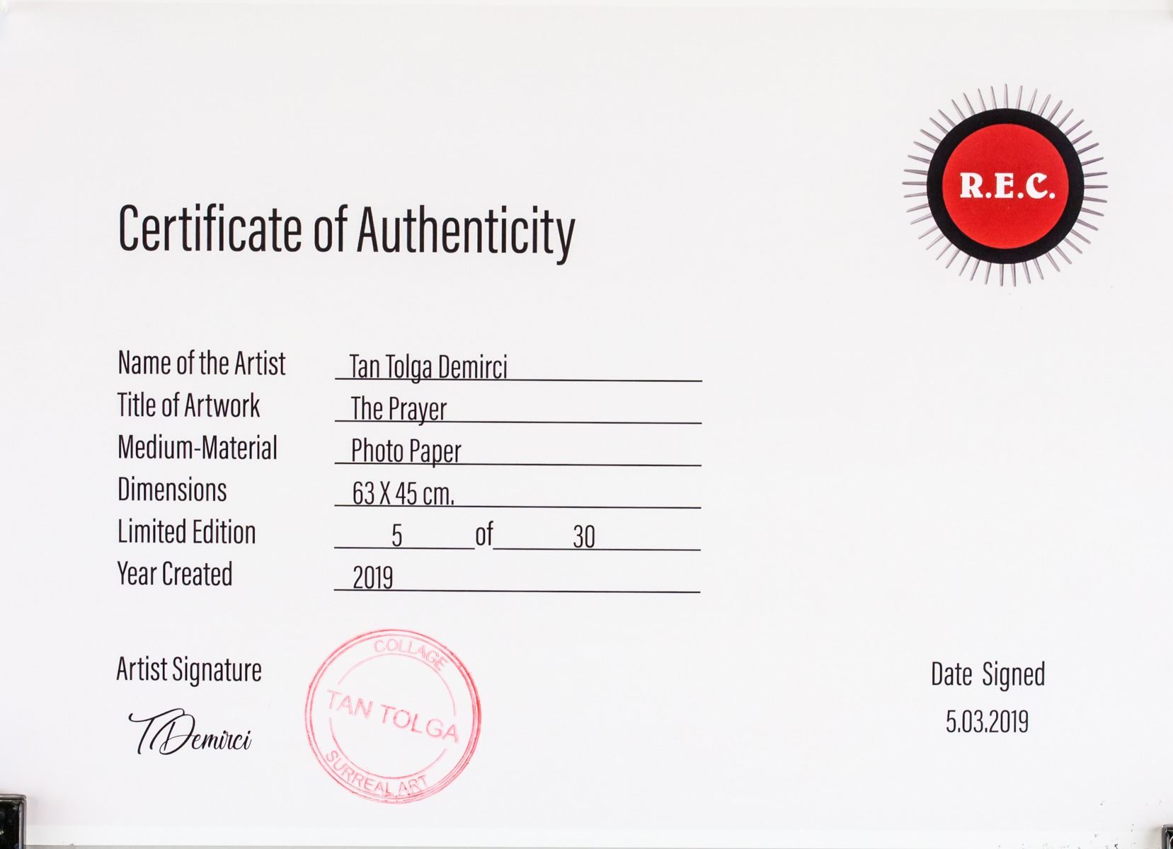 Digital collage, print on photo paper. Featuring surrealist scene titled "The Prayer". Verso with artist stamp and signed demirci. No. 5 of 30. Created by Tan Tolga Demirci (1974- , Turkish). With certificate of authenticity offered by artist directly. 63 x 45 cm (24.8 x17.7 inches)