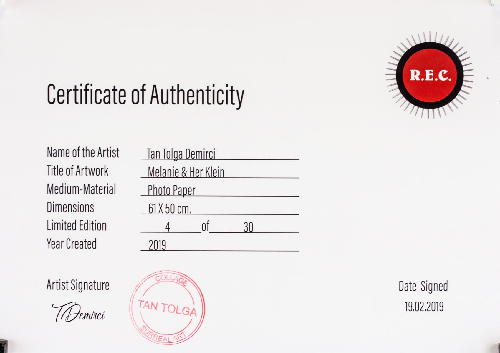 Digital collage, print on photo paper. Featuring surrealist scene titled "Melanie & Her Klein". Verso with artist stamp and signed demirci. No. 4 of 30. Created by Tan Tolga Demirci (b.1974, Turkish). With certificate of authenticity offered by artist directly. 61 x 50 cm (24 x 19.7 inches).
