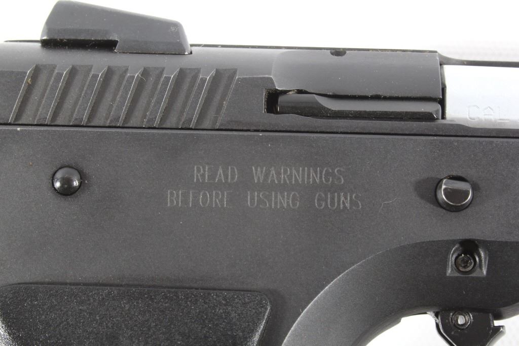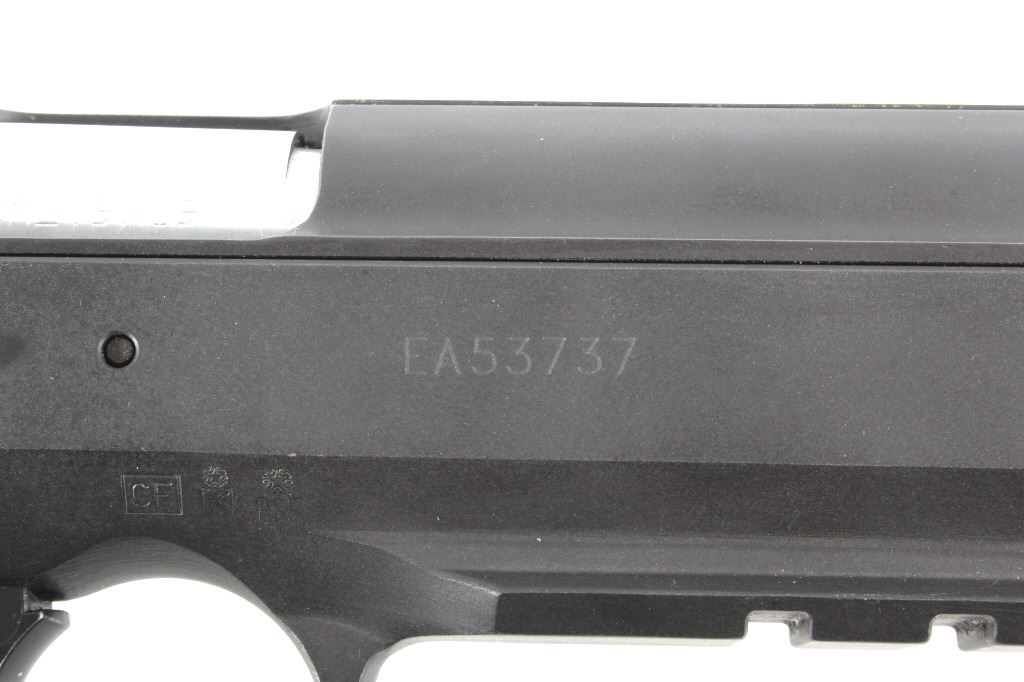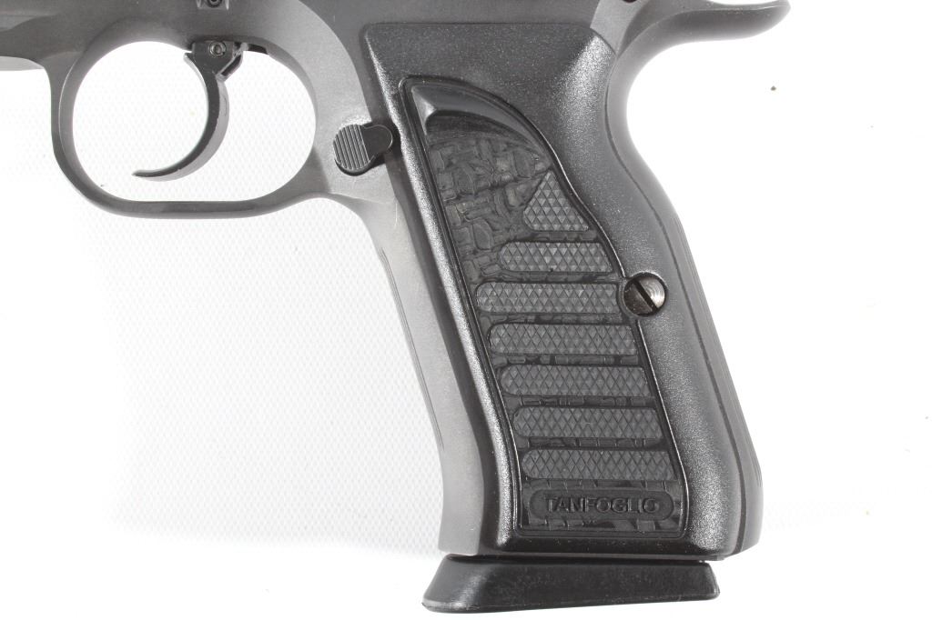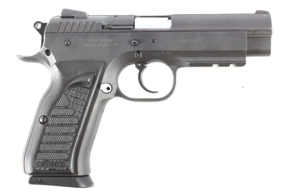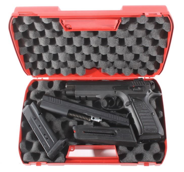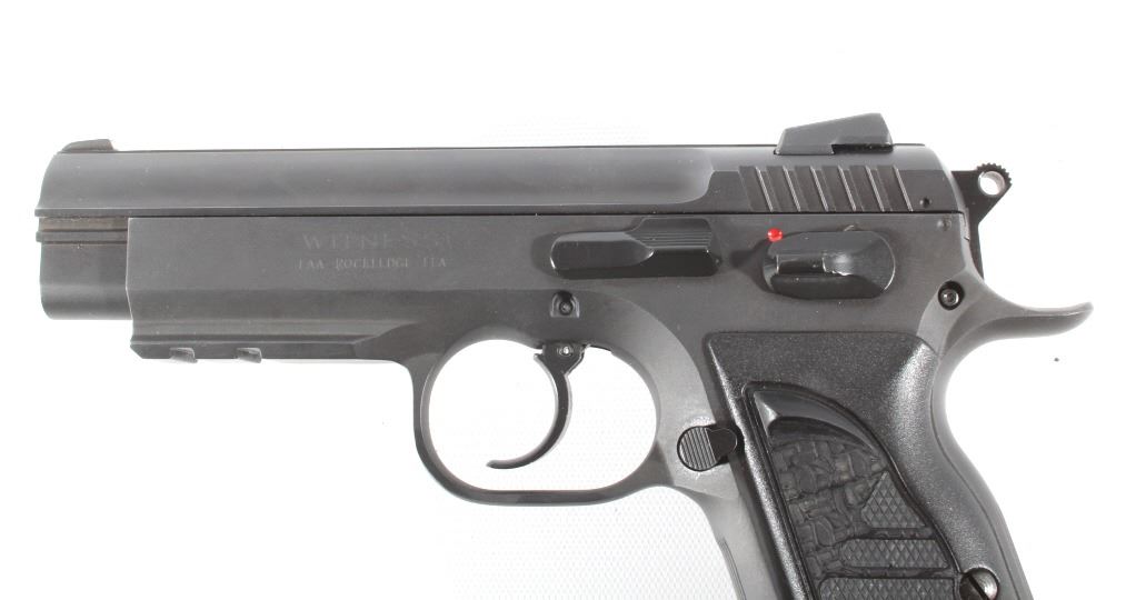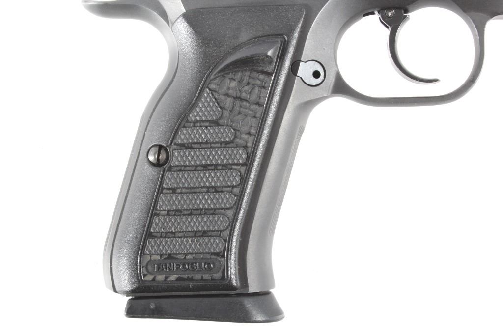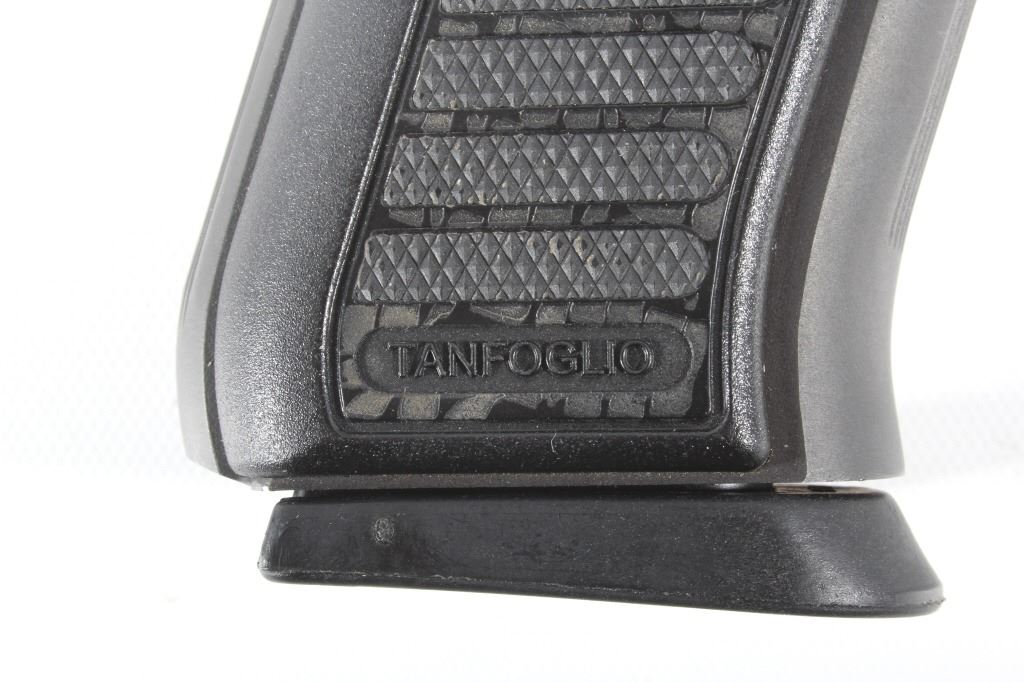 This lot features a Tanfoglio EAA Witness 9mm/.22 LR Pistol with Case. The pistol features 4 1/2" barrel, two 17 round 9mm magazines, one 10 round .22 LR magazine, 9mm slide, .22 LR slide, case, and blue'd finish. The Tanfoglio Combat or Standard, also known as T(A)95 or EAA Witness Steel, is a modified clone of the Czech CZ-75/CZ-85 pistol. It is made in Gardone Val Trompia near Brescia, Italy by Fratelli Tanfoglio S.N.C.. This pistol is in good condition, with few signs of wear. The mechanics are tight and smooth. The bore is bright and shows strong rifling. This is a modern firearm. FFL transfer or NICS background check required. The serial number is EA53737
