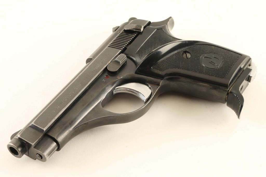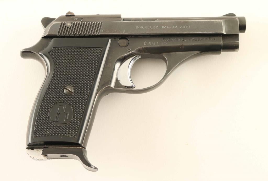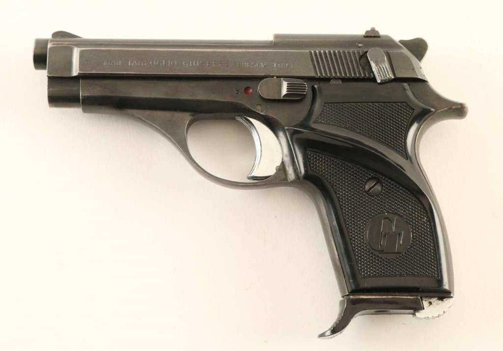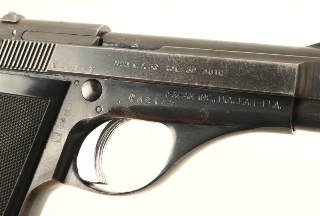 Pistol, Semi-automatic, 7+1 capacity. Italian made pistol , imported by Excam, Hialeah, Fla. Import marked on right side of frame. 3 3/4" barrel, with fixed open sights. heel magazine release. Serrated slide. Chrome, serrated trigger. Thumb safety on slide, and frame, Left side. Blued metal finish. Black plastic, checkered "TG" grips, with thumb rest on the left panel. Action is smooth/tight. Bore appears very good, but dirty. Grips are very good. Blued finish is about 80%, with wear to the edges, and slide. Comes with one 7-rd magazine, with finger extension. NRA Condition-very Good. Modern Firearm.