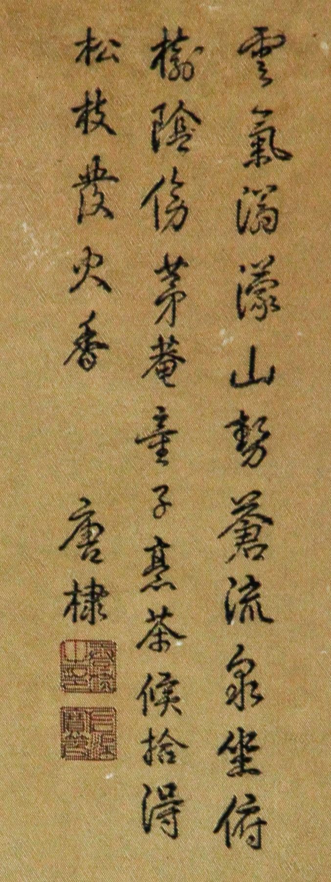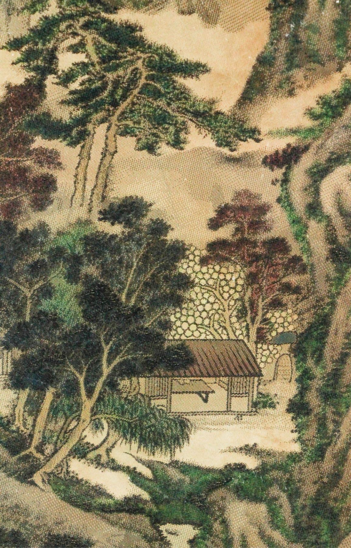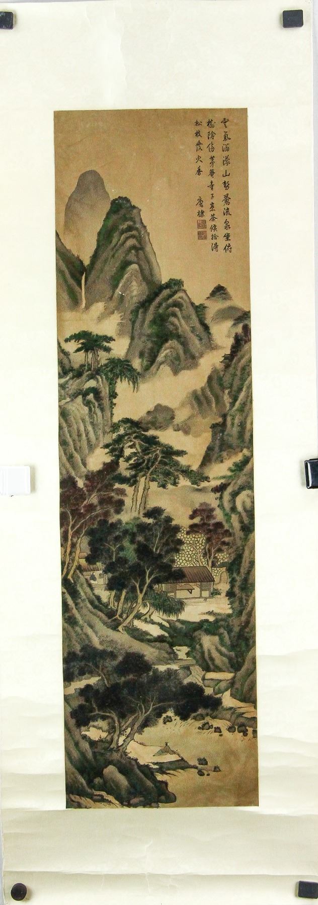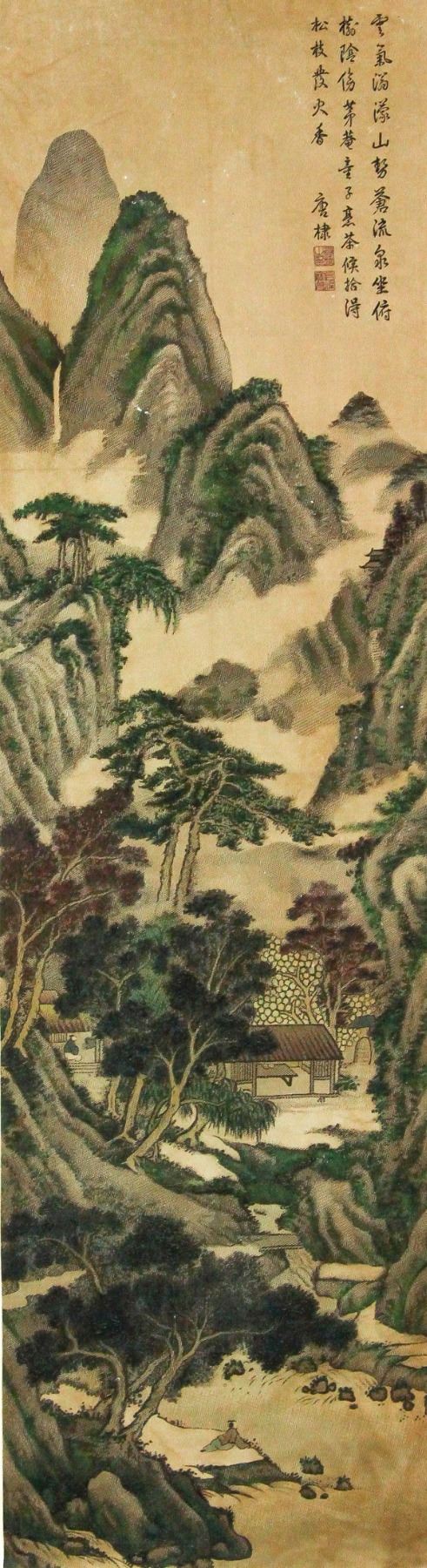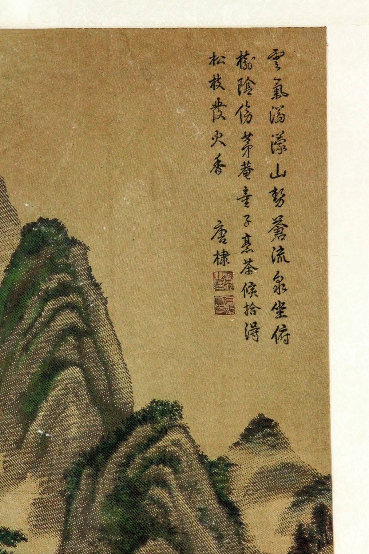 Lithograph print on silk roll. Featuring a landscape scene. Attributed to Tang Di (1296-1364, Chinese). 88.5 x 24.5 cm.