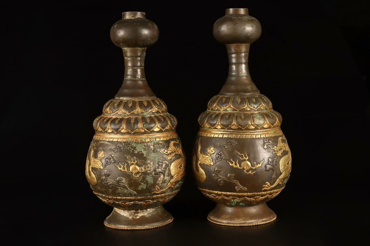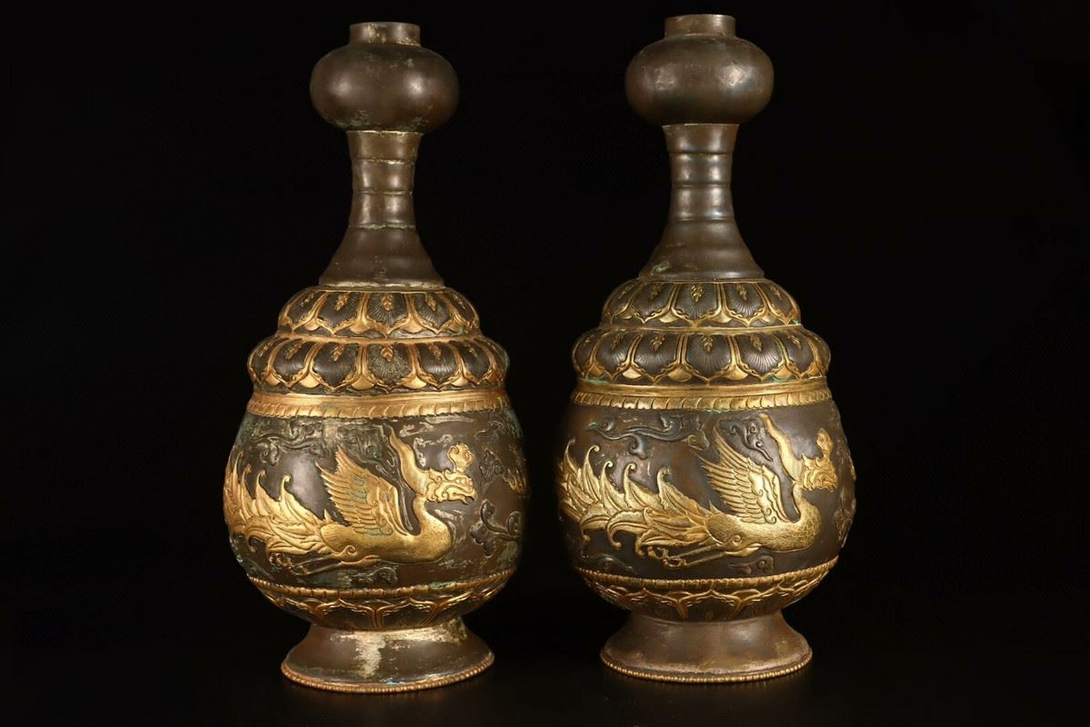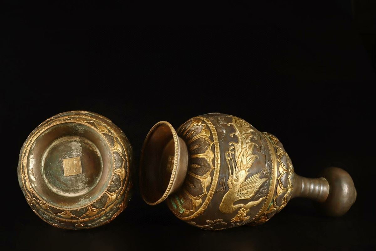 This exquisite pair of vases from the Tang Dynasty features intricate copper-glazed craftsmanship with golden and silver inlays. The dragon and phoenix motifs, symbolizing imperial power and harmony, are meticulously etched into the surface. The dynamic figures of the dragon and phoenix intertwine with traditional floral patterns, making these vases a perfect representation of the grandeur and artistry of the Tang Dynasty.