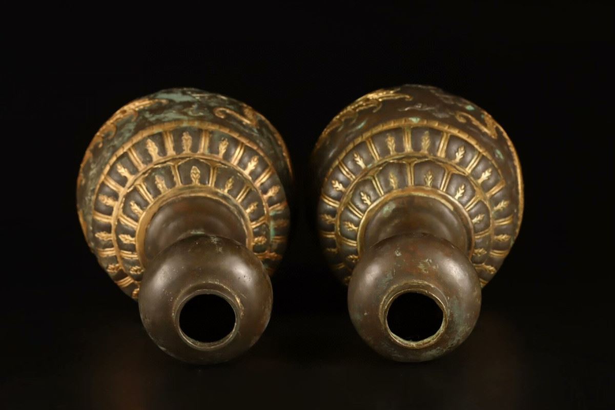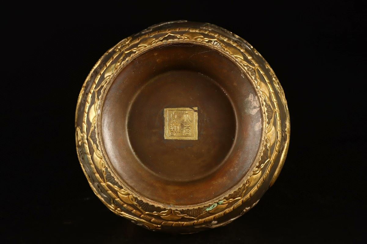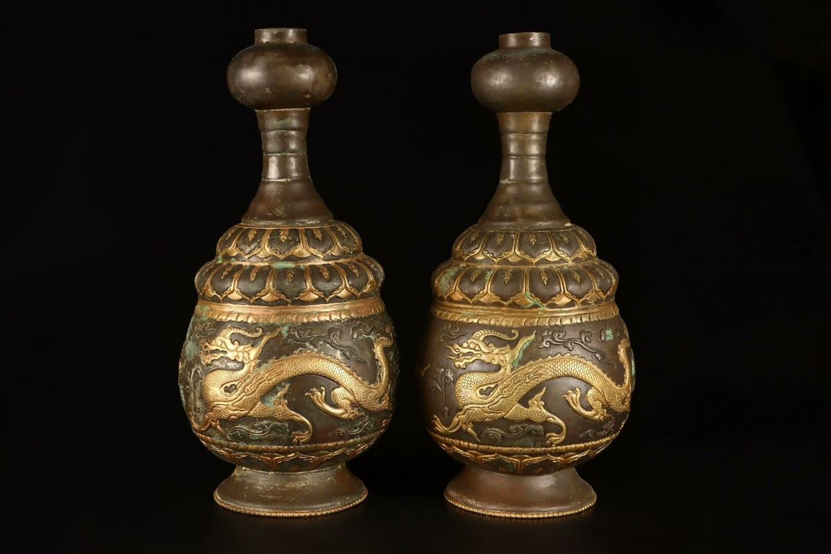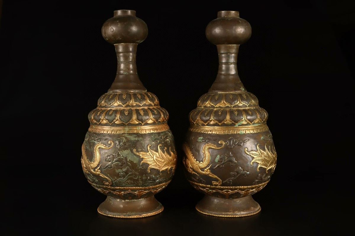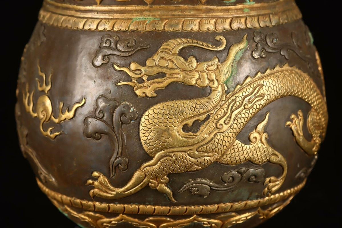 This exquisite pair of vases from the Tang Dynasty features intricate copper-glazed craftsmanship with golden and silver inlays. The dragon and phoenix motifs, symbolizing imperial power and harmony, are meticulously etched into the surface. The dynamic figures of the dragon and phoenix intertwine with traditional floral patterns, making these vases a perfect representation of the grandeur and artistry of the Tang Dynasty.