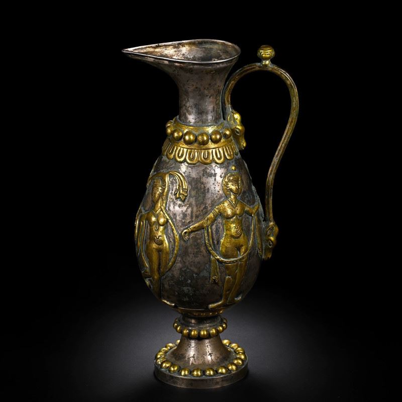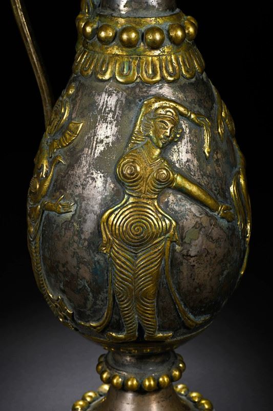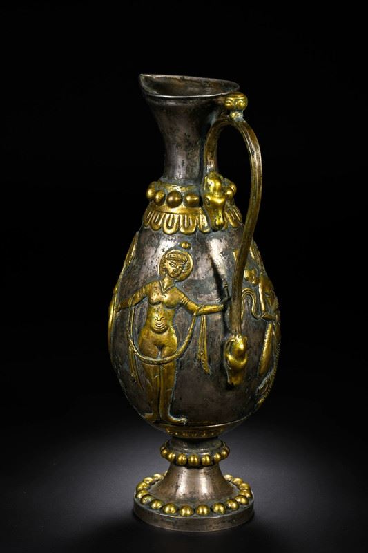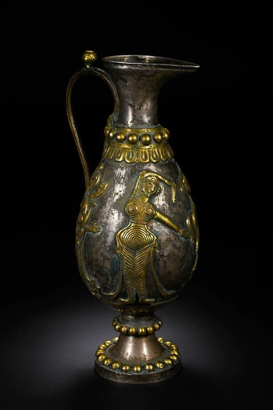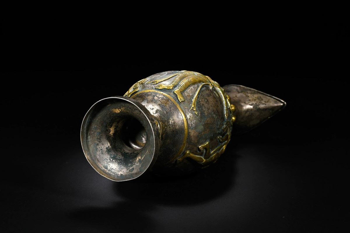 This wine pot blends the unique elements of Tang Dynasty and Persian culture, showcasing exquisite gilded silver craftsmanship. The intricate carvings on the pot and the Persian-style patterns reflect the exchange and fusion of Eastern and Western cultures. The smooth lines of the pot, combined with the metallic sheen and detailed decorations, demonstrate the Tang artisans' pursuit of precision and artistic perfection. This wine pot not only symbolizes the lifestyle of Tang aristocracy but also highlights the deep connection between Persian and Chinese cultures.