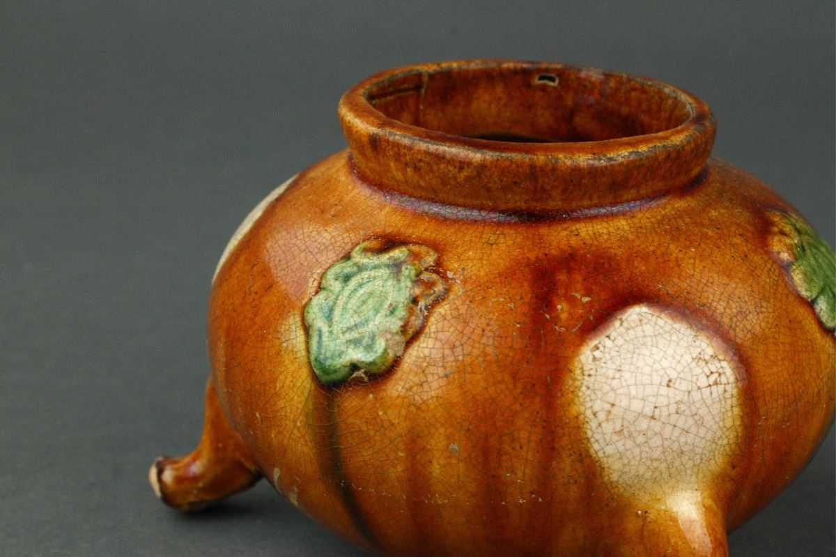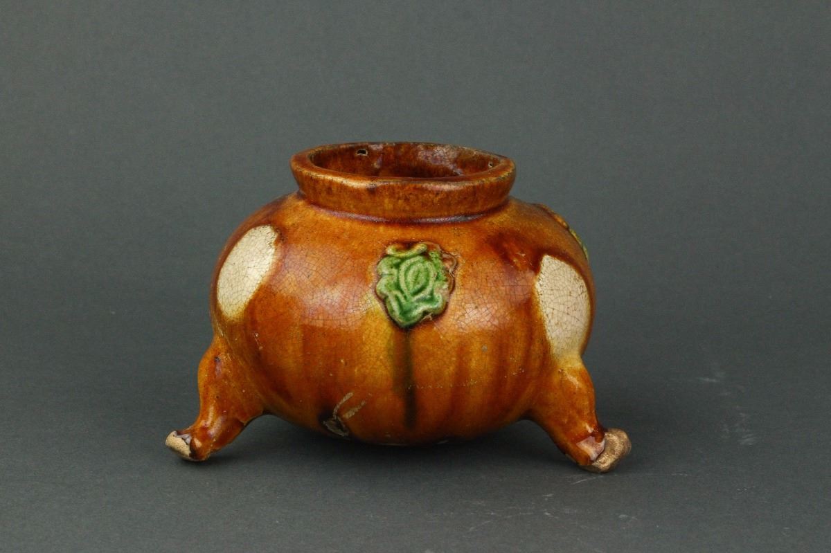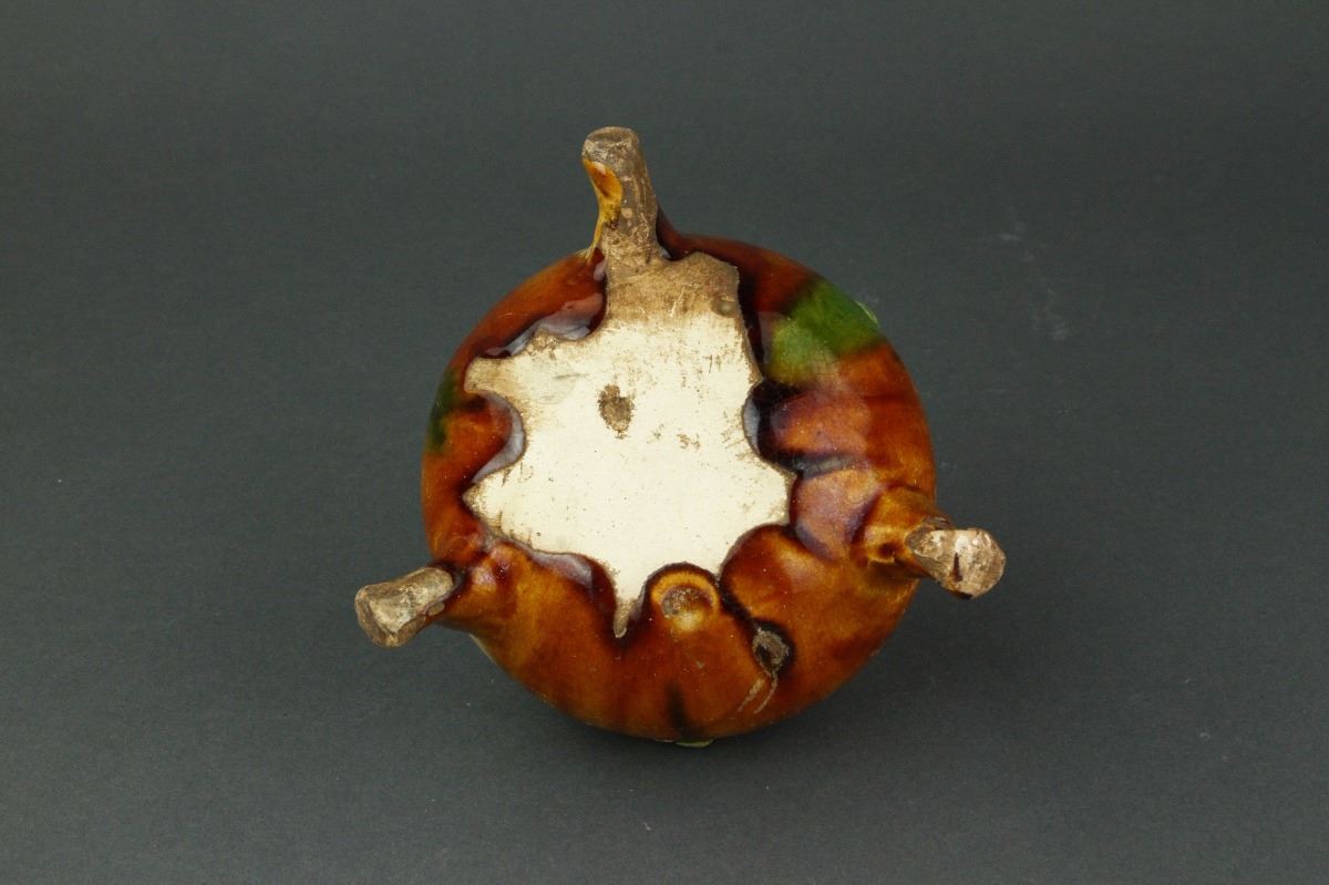 Chinese Sancai pottery censer; Tang style; of globular body supported by three feet; covered in russet, green and white glaze; H: 6 cm, D: 8 cm, 279 grams