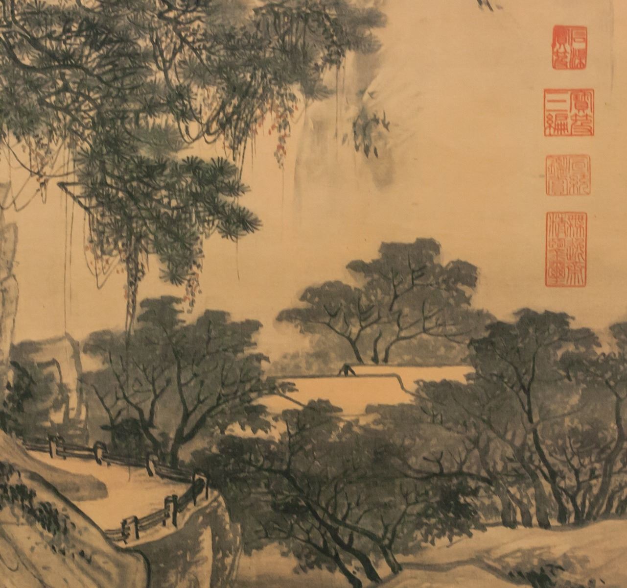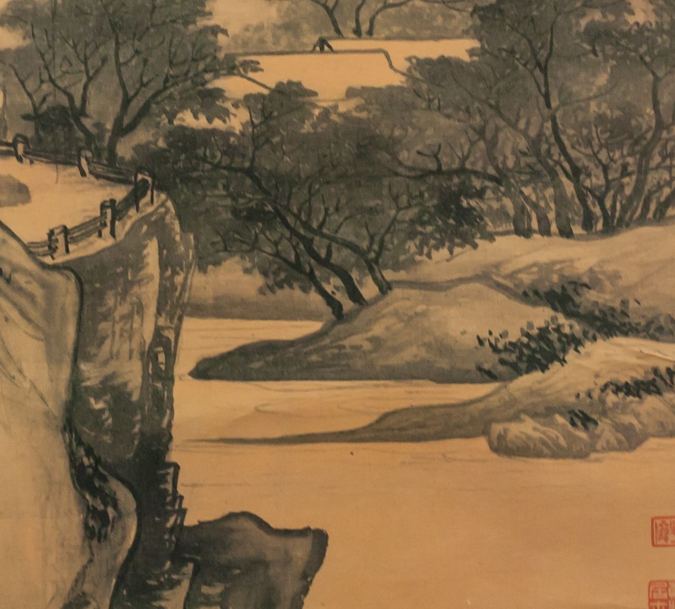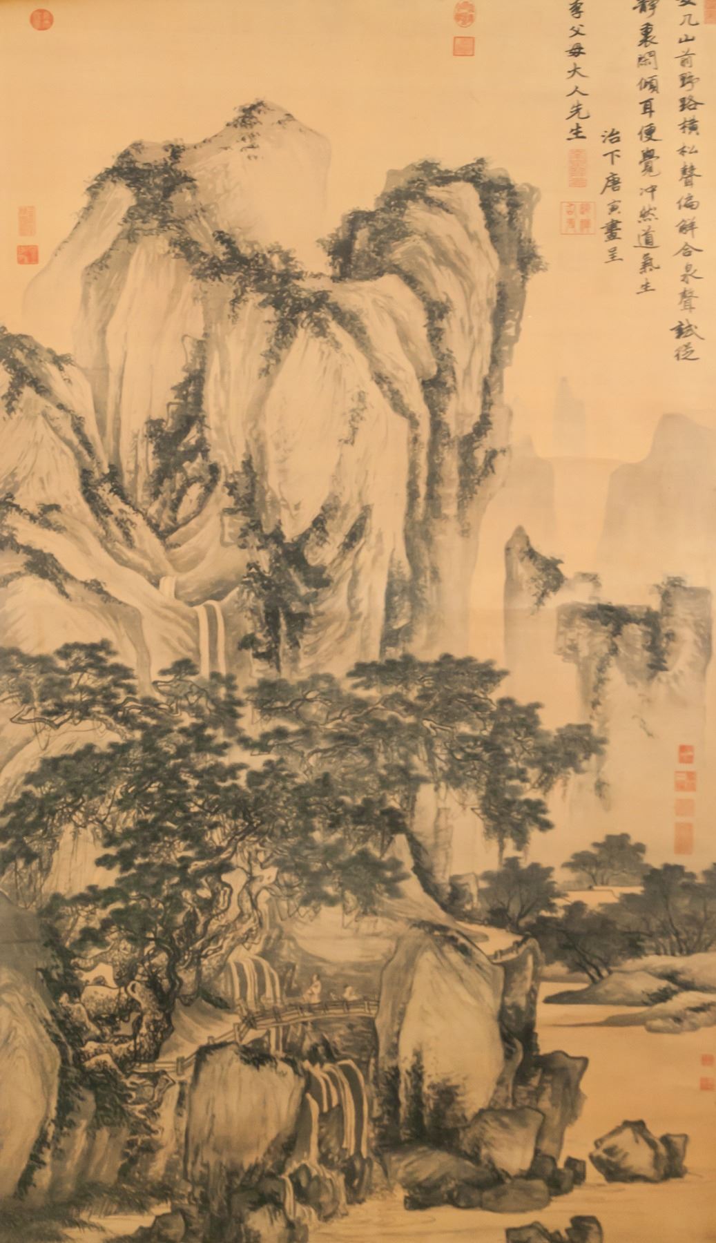 Print on paper, hanging scroll. Featuring mountainous landscape. Originally painted by Tang Yin (1470-1524, Chinese). 103 x 59 cm