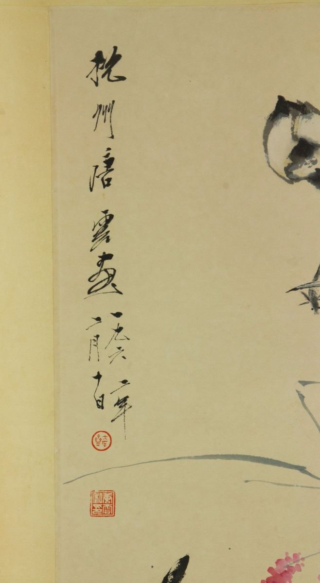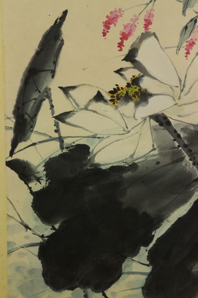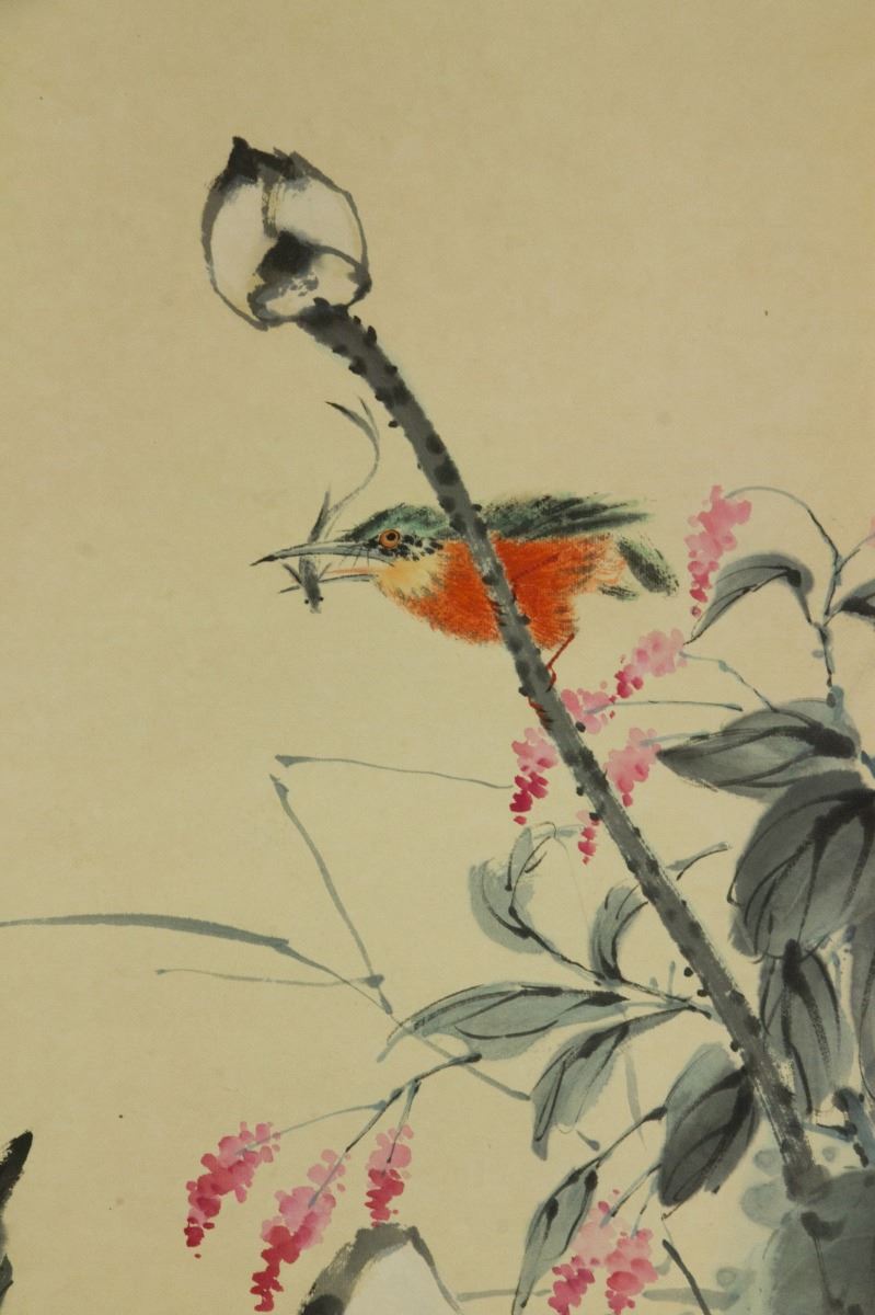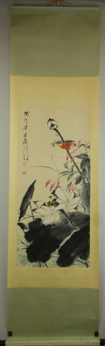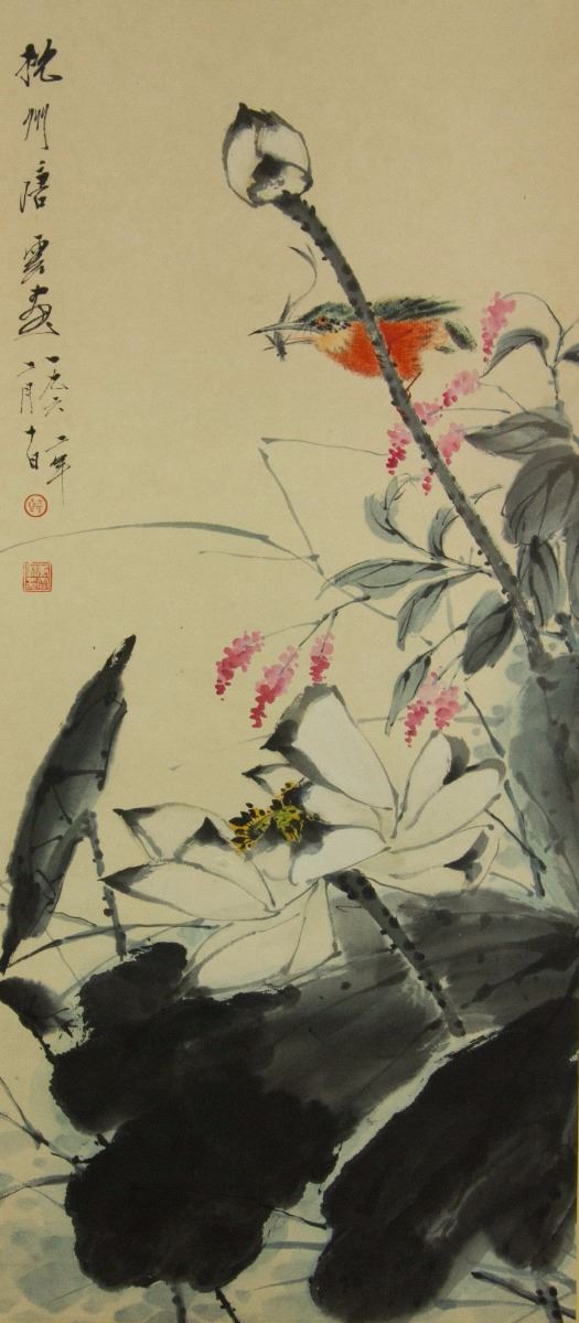 Preying kingfisher on lotus; Chinese ink and watercolour on paper; hanging scroll; signed Tang Yun (1910-1993); inscribed with 2 artist seals; 91 cm × 41 cm