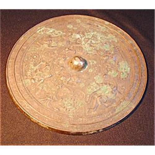 Ancient Chinese Tang period mirror decorated in high relief with dragons and human figural design. The outer ring has a scroll design. An inner narrow ring carries inscriptions. The wide central ring has an intricate design of 2 dragons and flanking a few human figures. The inner ring features 2 dragons. Excellent condition with dark patina on its surface. Dimensions: 9 inches diameter (23 cm.). Estimated value: $1.750.